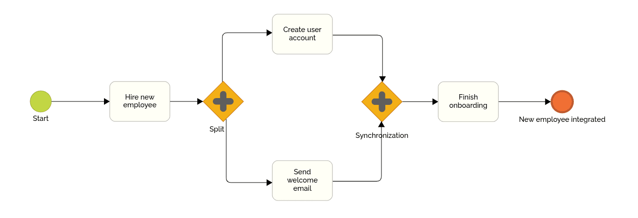 When you use a Parallel Gateway to split the process into multiple branches, all paths will run simultaneously. If these branches need to come back together later, you should use another Parallel Gateway to synchronize them — especially if the process ends with a trigger (like a message, signal, or escalation).