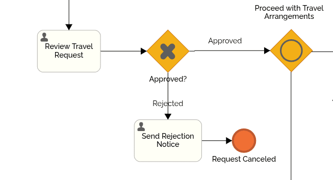The first gateway encountered in the process is an Exclusive Gateway. It is used after the travel request has been reviewed. Only one outcome is possible: