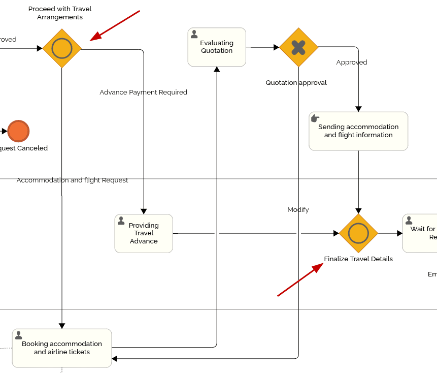 This BPMN diagram for travel requests is a great example to illustrate how different gateway types can be applied in real-life business processes.