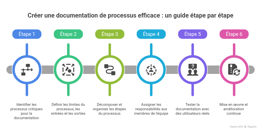Créer une documentation de processus efficace est une activité systématique. Suivre ces étapes garantit l'exhaustivité et l'utilisabilité.