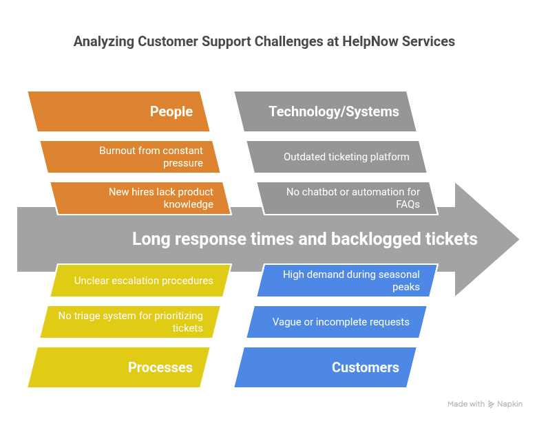 The customer support team at "HelpNow Services" is struggling with long response times and backlogged tickets, affecting client satisfaction.
