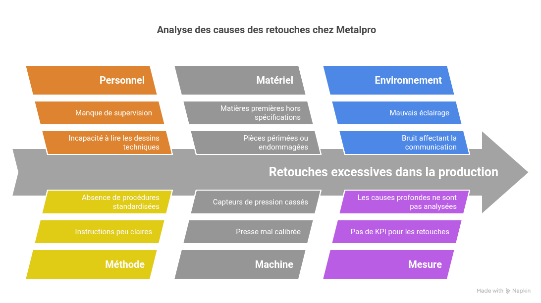 - Mesure : pas de KPI pour les retouches ; les causes profondes ne sont pas analysées