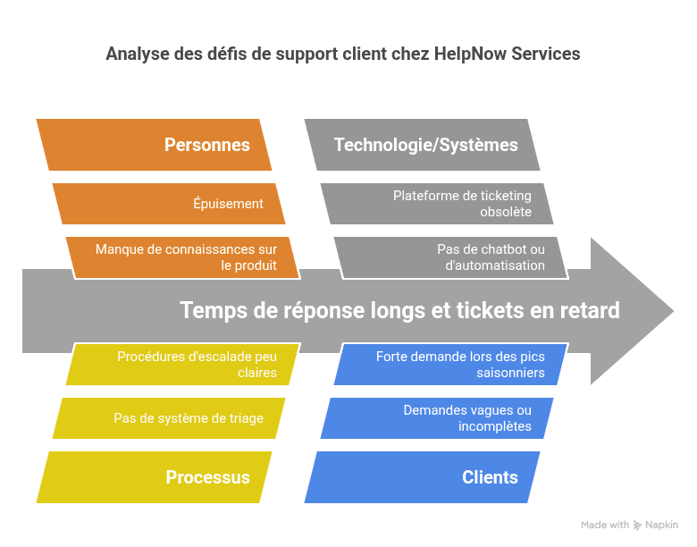 L'équipe de support client chez "HelpNow Services" a du mal avec des temps de réponse longs et des tickets en retard, affectant la satisfaction des clients.