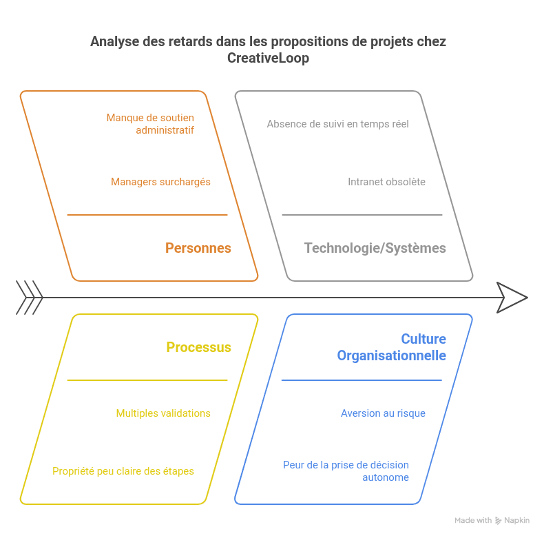 Dans l'agence de marketing "CreativeLoop", les propositions de projets internes sont souvent retardées pendant des semaines en attente d'approbation de la direction, ralentissant la livraison des campagnes.