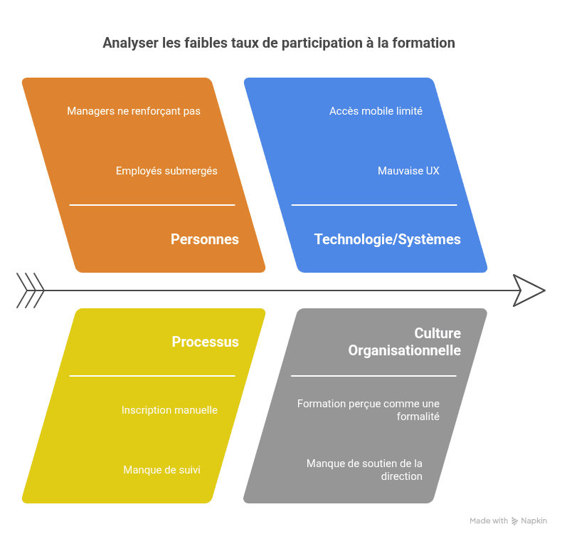 - Processus : l'inscription à la formation est manuelle et chronophage ; pas de suivi ou de renforcement structuré