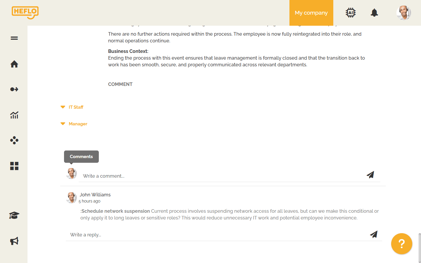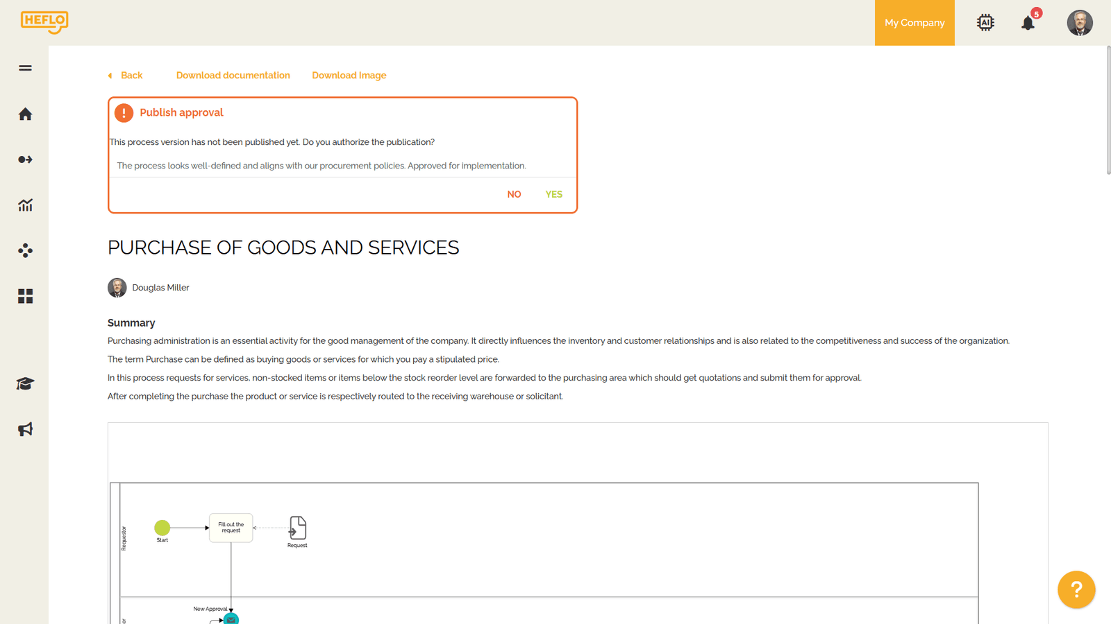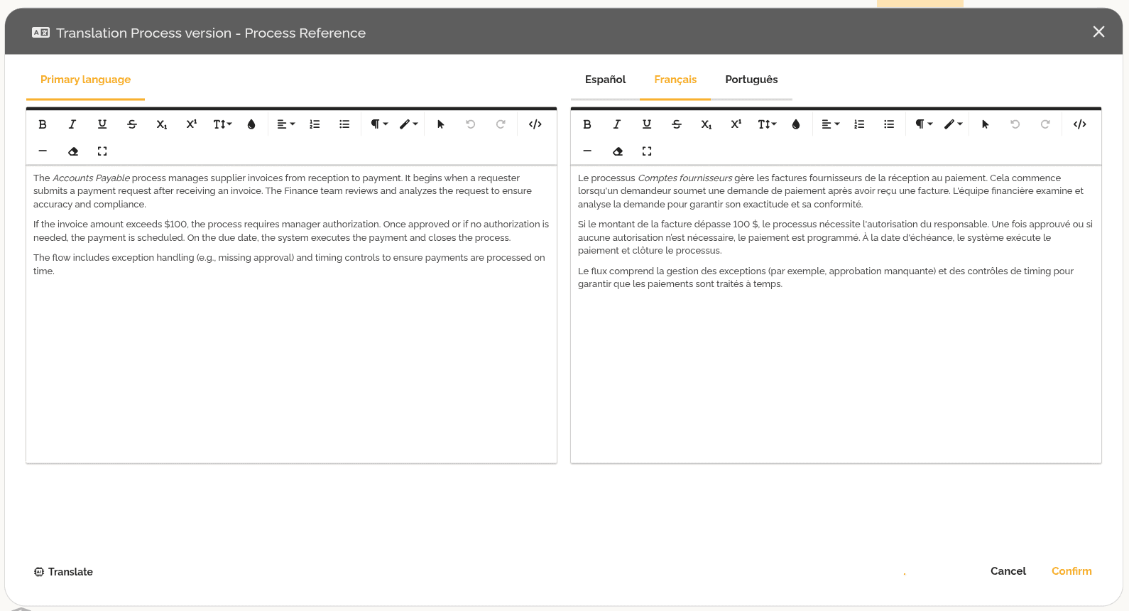 No worries! Our artificial intelligence will assist you with this task. Simply provide the name of the process, its requirements, and the organization profile, and the tool will automatically generate a process that will later be reviewed and refined by the analyst.