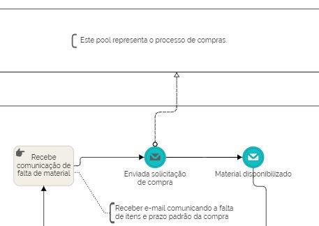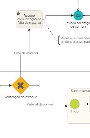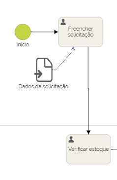 Este processo inclui 2 atores, solicitante e almoxarifado, que atuam em 2 raias de uma piscina. Além disso, pode haver necessidade de se acionar outro processo, o de compras, em outra piscina.