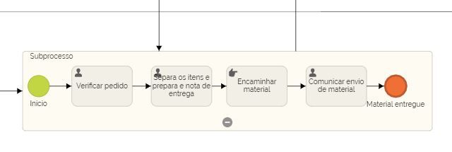 O subprocesso conta com as seguintes tarefas: verificação do pedido, separação dos itens e da nota de entrega, encaminhamento do material e comunicação do envio do material.