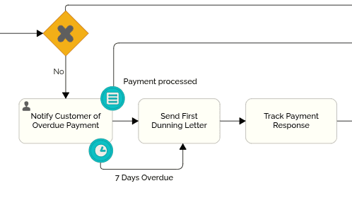 In this example, if no action is taken within 7 days after notifying the customer of an overdue payment, the process automatically moves forward to the next step. This makes the flow more predictable and easier to manage.