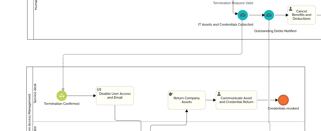 In this example, the employee termination process starts in HR and triggers actions in the IT team to revoke system access. This level of coordination is essential in larger organizations, where processes require precise control and clear accountability.