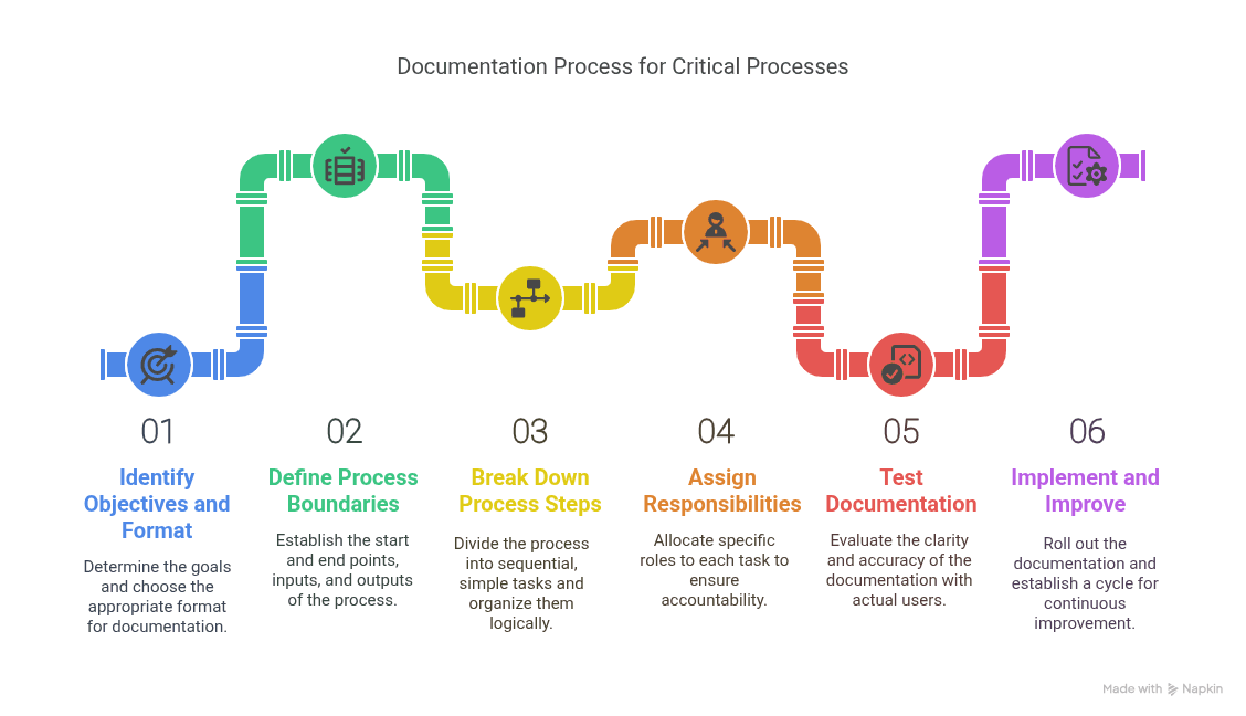 Créer une documentation de processus efficace est une activité systématique. Suivre ces étapes garantit l'exhaustivité et l'utilisabilité.