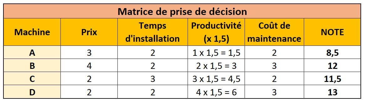Matrice de prise de décision : quelle machine doit-on acheter ?