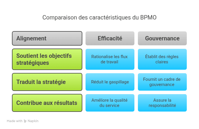- Lier le Travail de Processus aux Objectifs d'Affaires: Le BPMO relie explicitement les initiatives d'amélioration des processus et les métriques de performance aux objectifs stratégiques de l'organisation.